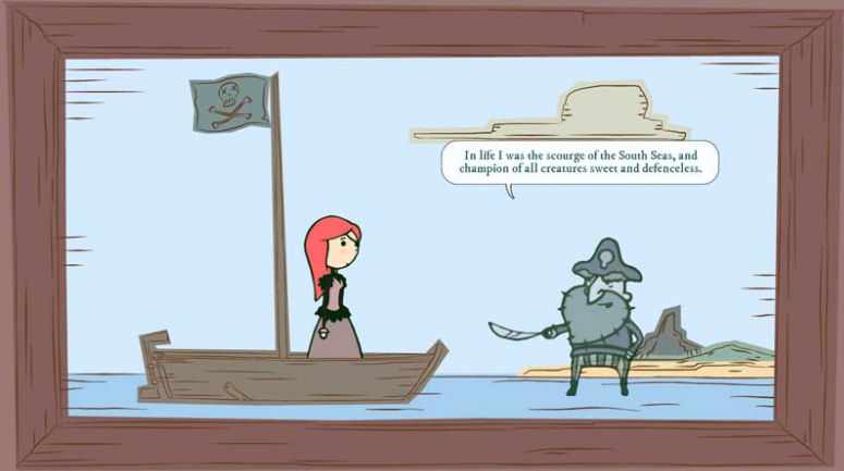The heart of a great adventure game is a good story. Everything else; graphics, dialog, sound and puzzles must support the story seamlessly. Nelly Cootalot Spoonbeaks Ahoy, a prequel1 to Nelly Cootalot and the Fowl Fleet, applies this dictum very well. The whimsical story reminds me of something a child might dream up after an epic sleepover with friends. Nelly Cootalot, a little girl who longs to be a respected pirate, is sleeping when she is called by her spectral mentor, Captain Bloodbeard, to take up the title of, “Defender of all creatures sweet and defenseless.” She must rescue Spoonbeaks, birds which make their home on Meath Island, from the infamous Baron Widebeard. Nelly believes this is a worthwhile reason to interrupt her “sleepy-time” and readily accepts her quest.